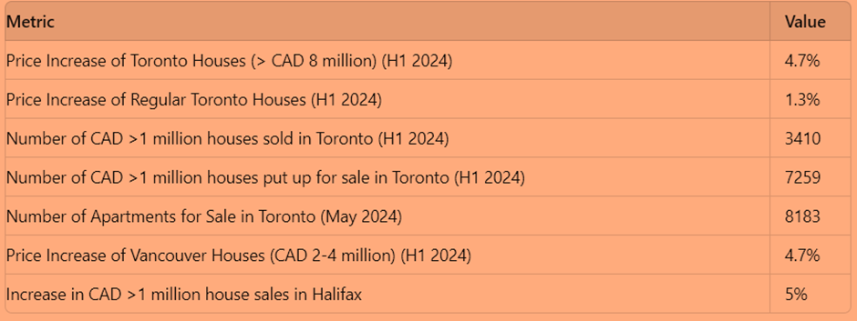 In Canada fancy houses are doing better than regular ones. A company called Engel & Volkers said this in a report. In Toronto houses that cost more than 8 million Canadian dollars went up in price by 4.7 percent. This happened in the first half of 2024. Regular houses only went up by 1.3 percent. Even though fewer fancy houses are being sold their prices are still going up.