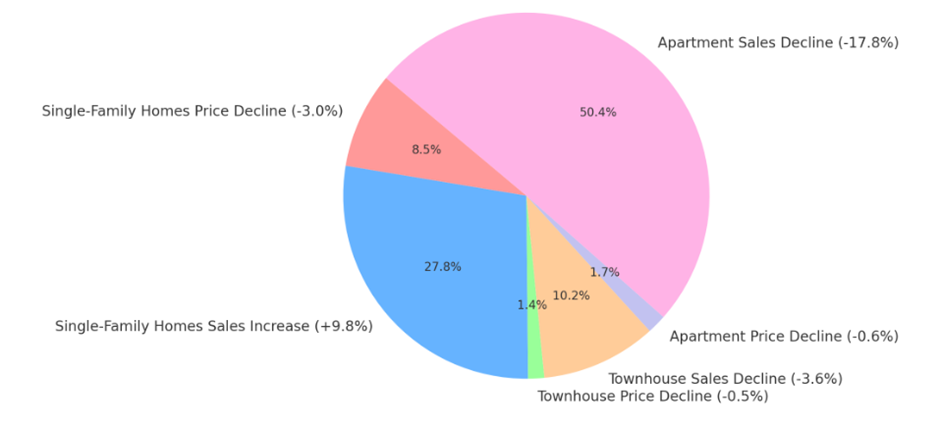 The comparison of three types of property highlights different market dynamics. Sales rose despite falling prices for single-family homes, indicating high demand. Townhouse prices and sales fell slightly, indicating a balanced market. Properties faced a sharp decline in sales volume despite maintaining strong prices. These changes highlight the complexity of the Ottawa real estate market and the need for nuanced understanding based on property type.