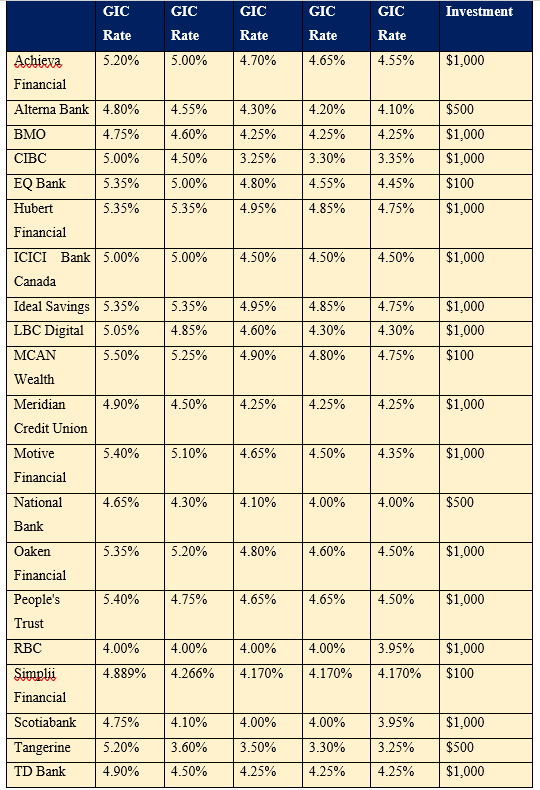 Table: GIC rates offered by various providers in Canada for different term lengths, along with the minimum investment required.